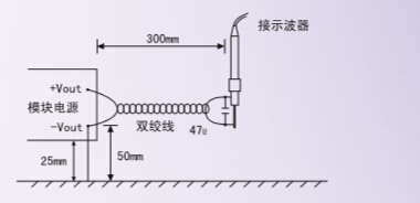 另一種方法是用雙絞線測(cè)量。適用于便裝式電源的測(cè)量,如圖十六所示。將電源放置在一個(gè)離接地板25mm之上 的地方,接地板由鋁或銅板構(gòu)成。電源的輸出公共端和AC輸入地端直接與接地板連結(jié),而且不長(zhǎng)于50mm(線徑應(yīng)> 1mm2)用16AWG銅線傲成300mm長(zhǎng)的雙絞線,一端接電源輸出,另一端并聯(lián)一只47μF的鉭電容,再接到示波器上。 電容的引線應(yīng)盡可能短,注意極性不要接反。示波器探頭的“地線”應(yīng)盡可能接到地線環(huán)。