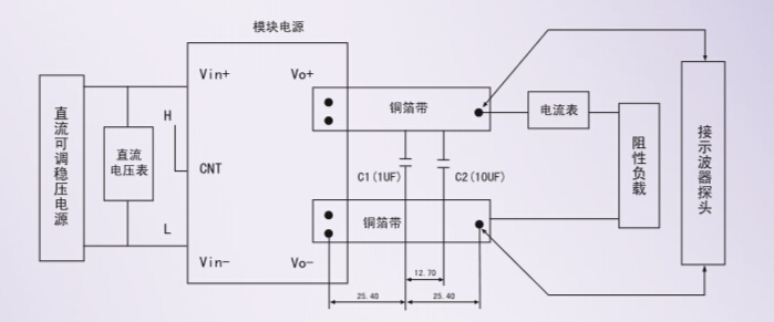 輸出紋波和噪聲是指疊加在輸出直流上交流成份,其中紋波是疊加在輸出直流上開關(guān)頻率的諧波分量,而噪聲電 壓是與開關(guān)頻率無關(guān)的非周期的分量。測(cè)試紋波和噪聲應(yīng)在規(guī)定的帶寬內(nèi)測(cè)試,一般用20MHZ帶寬,超20MHZ帶寬 的示波器可選用20MHZ帶寬限制,噪聲、紋波測(cè)試一般用mVp-p表示,測(cè)量時(shí)應(yīng)采用摸擬示波器選擇適當(dāng)?shù)牧砍蹋瑨?描速度應(yīng)低干0.5秒,測(cè)峰-峰值雜音電壓,接線如圖
